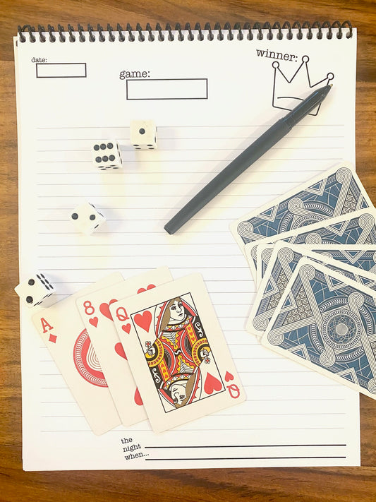 Upgrade your game nights with the Game Night Feels Right notebook. All notebooks come with 60 pages of score keeping, winner claiming, and memory making fun! The crown declares the winner and "the night when..." section always brings a smile. Let the games begin, make the memories last!